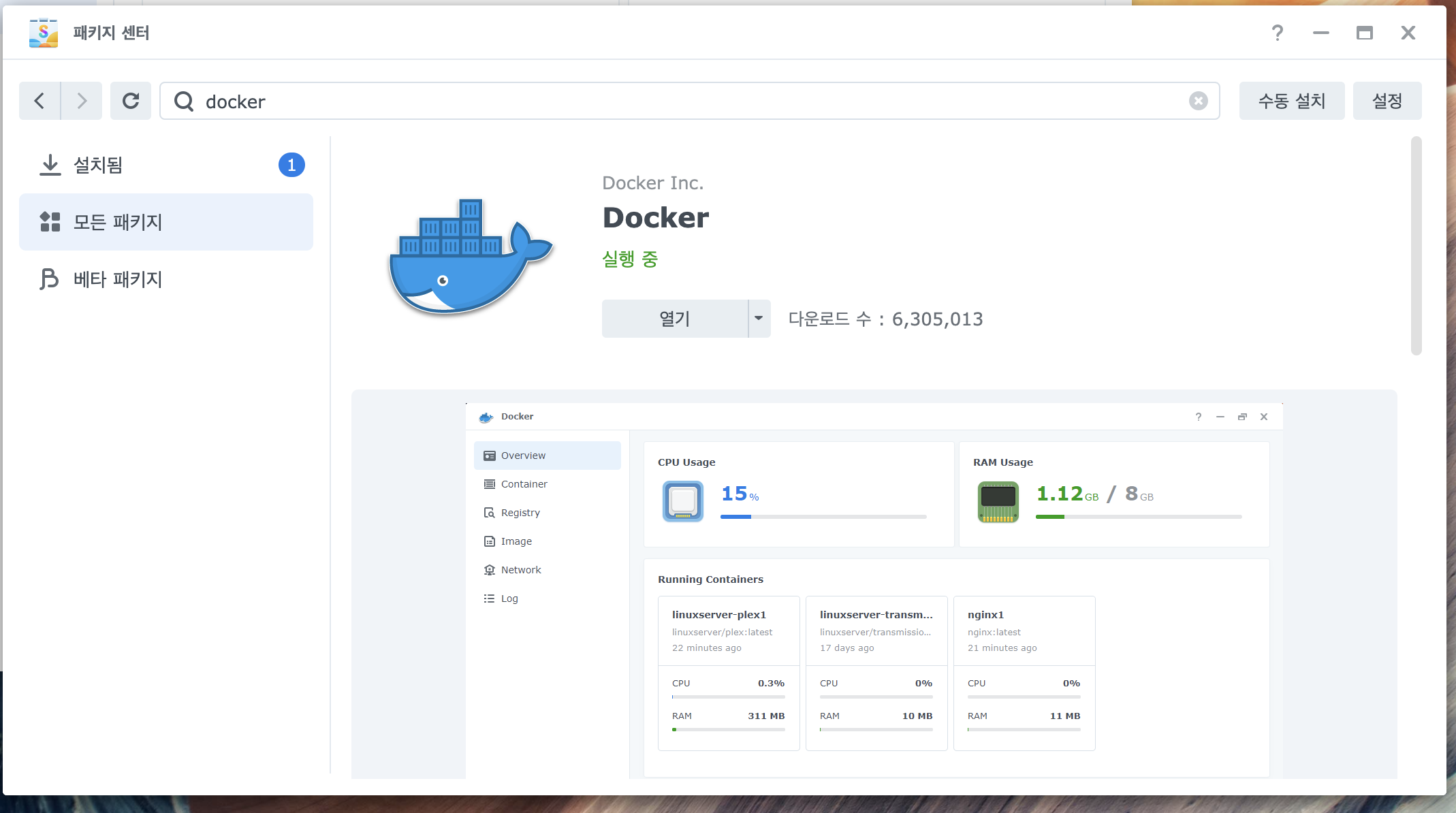 DSM ์์ ํจํค์ง ๋งค๋์ ๋ผ๊ณ ํ๋ ์ด ์คํ ์ด๋ ์ฑ์คํ ์ด ์ฒ๋ผ ์ํ๋ ํจํค์ง(์ฑ)์ ์ค์นํ ์ ์๋ ์คํ ์ด๊ฐ ์์ต๋๋ค. ๊ทธ๋์ ํจํค์ง ๋งค๋์ ์์ Docker์ ์ค์นํ์ค ์ ์์ต๋๋ค.