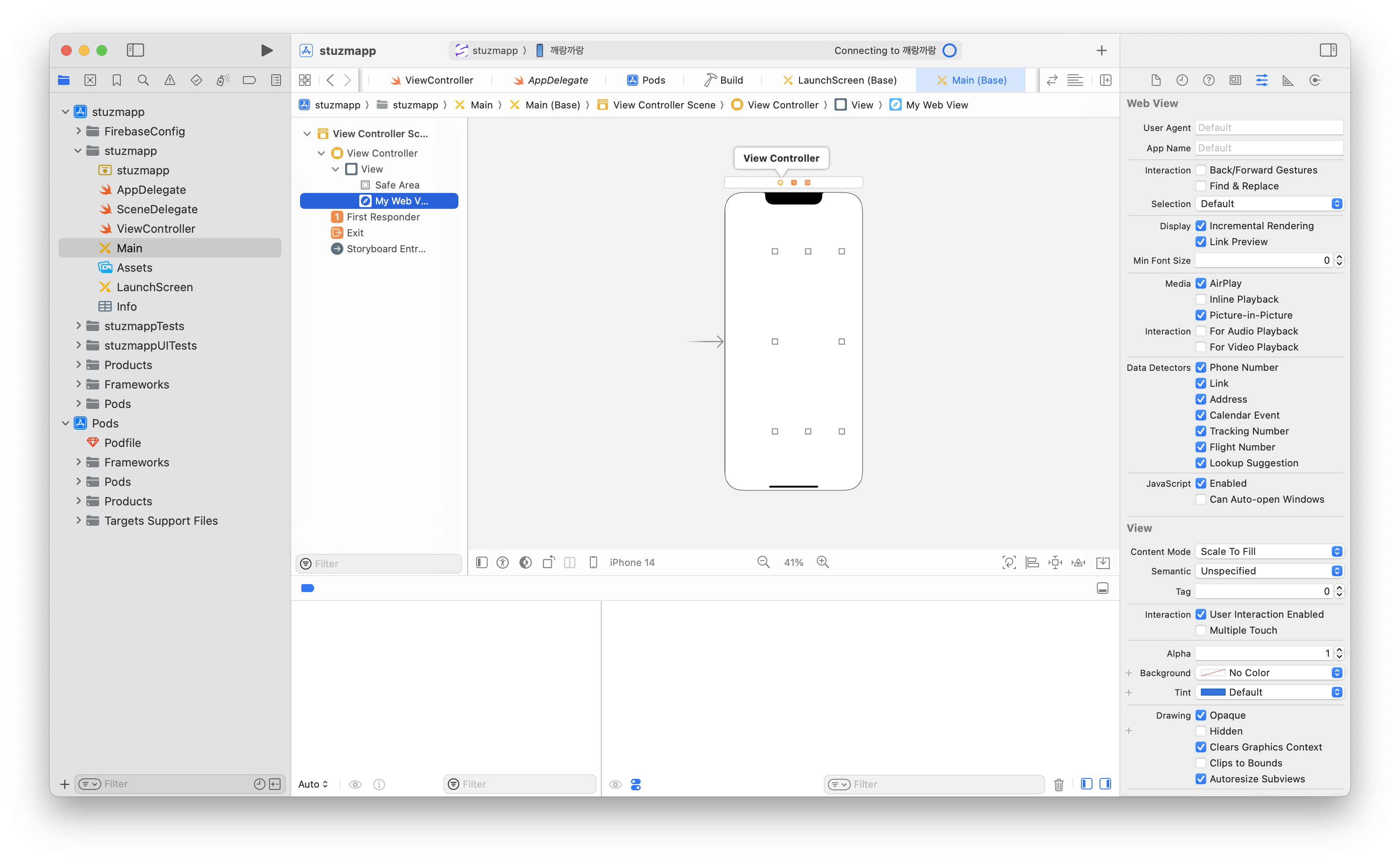 ๊ทธ๋ฆฌ๊ณ ์น๋ทฐ๋ฅผ Safe area์ ๋ง์ถฐ์ ์๋์ผ๋ก ์ฌ์ด์ฆ๋ฅผ ์กฐ์ ํด์ฃผ๋ ์ฝ๋๊ฐ ๋ค์ด๊ฐ ์๋ค. ๊ทธ๋์ ์น๋ทฐ์ ์ฌ์ด์ฆ๋ ์ค์ํ์ง ์๋ค. ๋ค๋ง, ์คํ ํ ๋์ ์์ฐ์ค๋ฌ์์ ์ํด ์์ ํฌ๋ช ์ผ๋ก ํด๋๋ ๊ฒ์ด ์ข๊ฒ ๋ค.