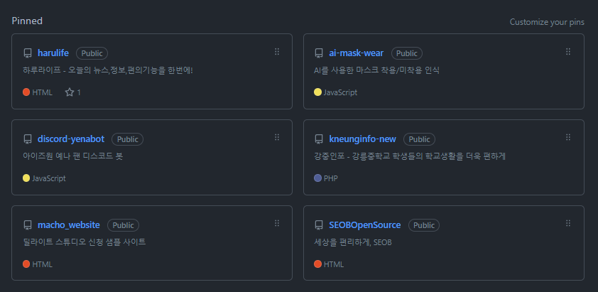 λ΄κ° μκ°νλ λνμ μΈ λ ν¬μ§μ€ν 리 6κ°λ₯Ό κ³¨λΌ κΉνλΈ νλ‘νμ κ³ μ ν΄λμμ΅λλ€. μ΄ λ ν¬λ€μ λ΄ κΉνλΈμ λ€μ΄κ°λ©΄ λ°λ‘ 보λ λ ν¬λ€μΈ λ§νΌ, λλ₯Ό λνλ΄λ λνμ μΈ λ ν¬λ€μ κ³¨λΌ κ³ μ ν΄λλκ²μ μΆμ²λ립λλ€. λν λ΄κ° κΈ°μ¬νκ±°λ μ°Έμ¬ν νλ‘μ νΈκ° μλ€λ©΄ κ³ μ ν΄λλ κ²λ μ’μ΅λλ€.